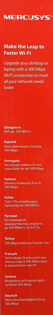 Скорость беспроводного соединения вместе с Mercusys MW300UM может достигать 300 Мбит/с. Wi-Fi адаптер имеет USB-интерфейс для подключения к компьютеру и внутреннюю несъемную антенну для приема волн. Размеры пластикового черного корпуса адаптера составляют 0.8x1.7x4.2 см.
