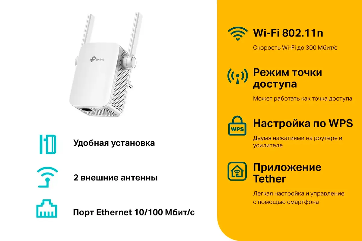 Частотный диапазон устройств Wi-Fi2.4 ГГцМакс. скорость беспроводного соединения300 Мбит/сПоддержка MIMOестьРежим репитера (повторителя)естьМетод шифрования данных WEPестьМетод шифрования данных WPAестьМетод шифрования данных WPA2естьWeb-интерфейсестьКоличество внешних антенн2Тип внешней антеннынесъемнаяКоэффициент усиления внешней антенны5 dBiМощность передатчика20 dBMШирина80 ммВысота77 ммГлубина78 ммПроизводительTP-LINKТип связиWi-FiТип устройстваусилитель сигнала (репитер)Стандарт Wi-Fi802.11b/g/nКоличество портов коммутатора1Скорость портов100 Мбит/сек -