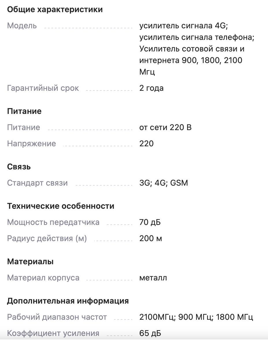 Радиус действия в помещении200 мТип связи2G/3G/4GТип устройстваУсилитель сигнала сотовой связи -
