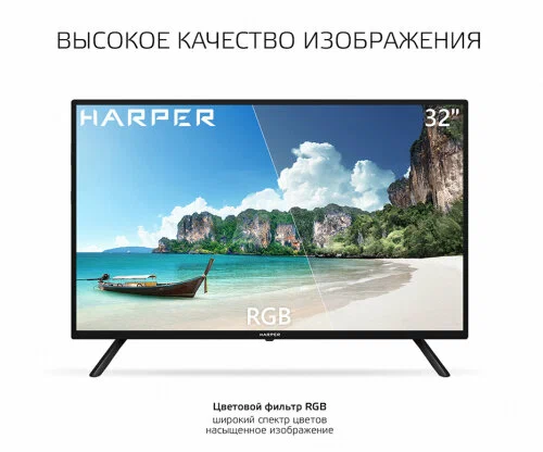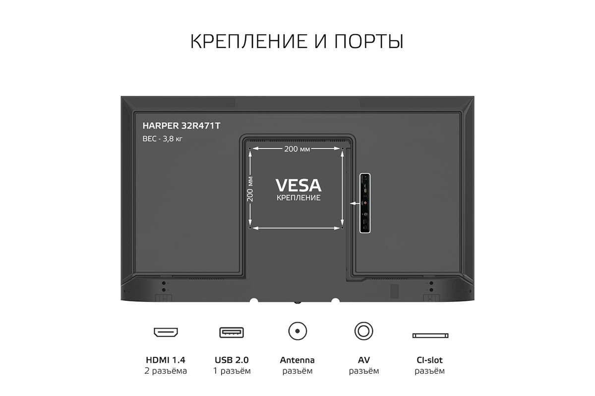 Harper 32R471T – это компактный, функциональный и ультратонкий жидкокристаллический телевизор, предоставляющий практически все современные возможности для работы с медиаконтентом. Телевизор поддерживает аналоговое, цифровое эфирное и цифровое кабельное вещание. Его также можно подключить к другим внешним устройствам (плееры, приставки, консоли для игр и т.п.). С ним вы сможете обойтись без стороннего медиаплеера. К встроенному порту USB можно подключать жесткие диски или накопители USB-Flash с записанными на них видео, музыкой, изображениями или даже текстом. Эфир любимого канала/программы легко и просто записать с линии (должен быть подключен высокоскоростной диск) или по заранее определенному расписанию. Вам доступны: удобный интерфейс на русском языке, поддержка телетекста, управление доступом и многое другое.