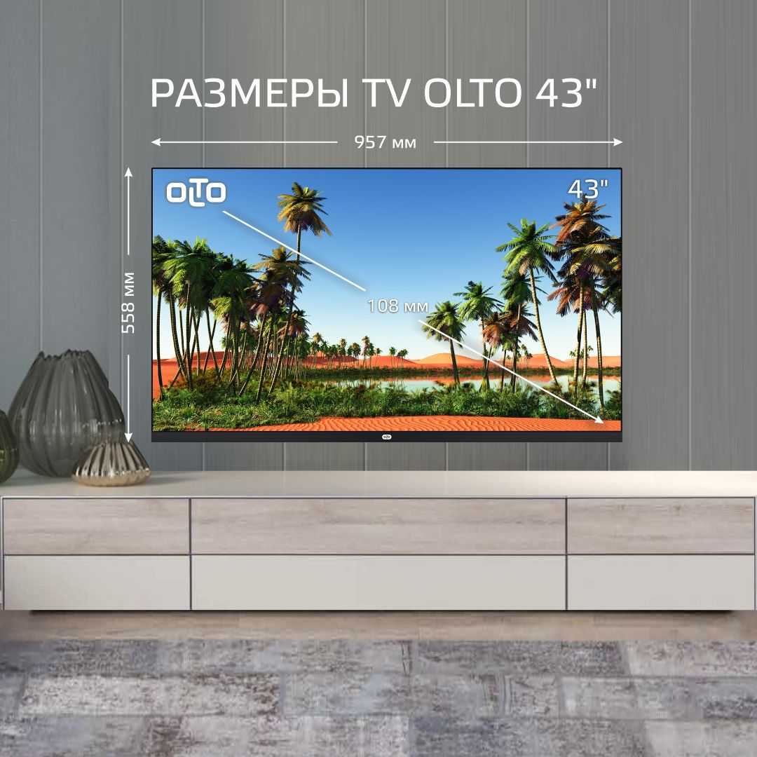 LED телевизор Olto 43ST20H поддерживает Smart TV, беспроводное подключение к интернету по Wi-Fi и прием сигналов эфирного и кабельного цифрового телевидения без установки дополнительных тюнеров.