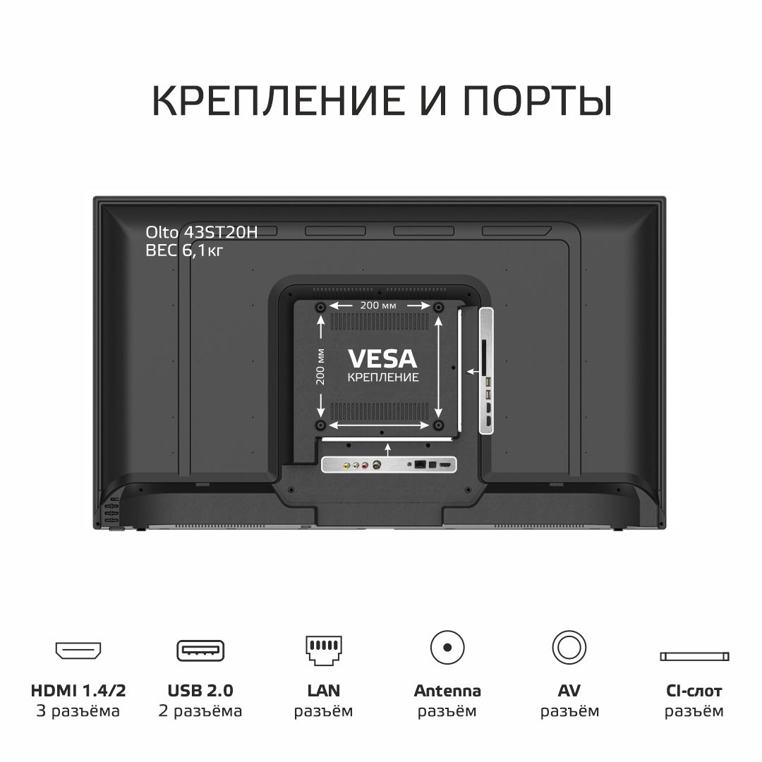 Телевизор способен воспроизводить видеозаписи, музыку или открывать изображения с flash-накопителей, жестких дисков и других внешних носителей информации с файловой системой FAT или NTFS. Множество разъемов, в том числе три HDMI-порта, обеспечивают максимальную функциональность LED телевизора Olto 43ST20H, позволяя с легкостью подключать к нему приставки, тюнеры, различные мобильные устройства, а также использовать его в качестве монитора персонального компьютера.