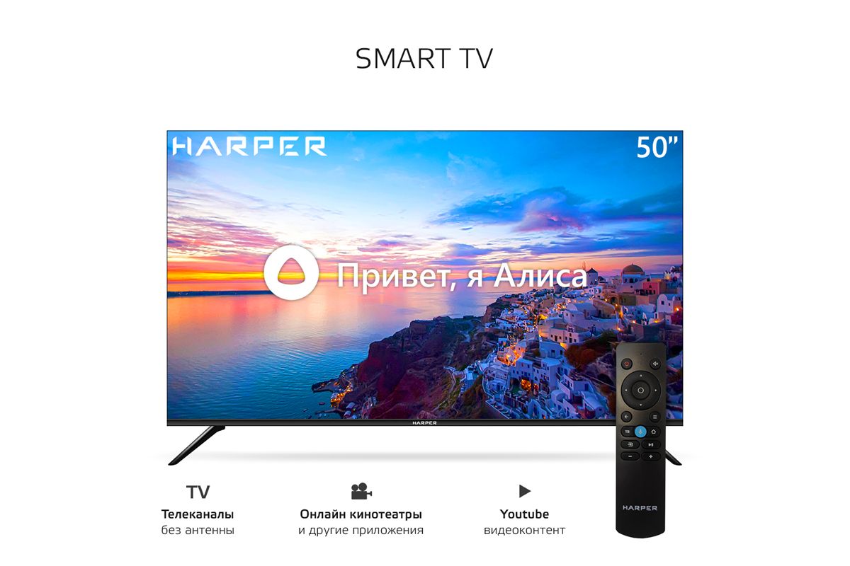 Harper 50U661TS - это современный широкоформатный телевизор с высококачественным экраном, поддерживающий технологию HDR10 и разрешение 4K (сверхвысокая четкость, Ultra HD). Стабильно принимать сигналы цифрового и кабельного вещания позволяют встроенные цифровые тюнеры, а с помощью функции SMART TV с Алисой, на базе Яндекс ТВ, вы сможете не зависеть от программы вещания, и в любое удобное время смотреть фильмы, сериалы и развлекательные шоу в сети интернет.